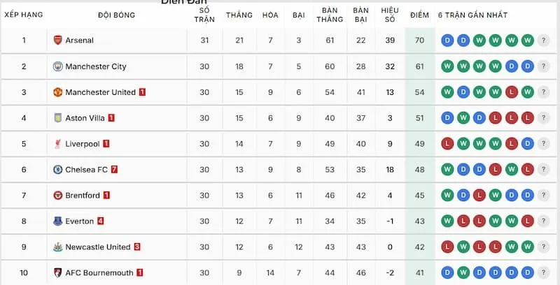 Hệ thống tự động cập nhật thứ hạng của các đội bóng ngay sau khi tiếng còi mãn cuộc vang lên. Bảng xếp hạng tại KQBD 247 hiển thị đầy đủ các thông số: